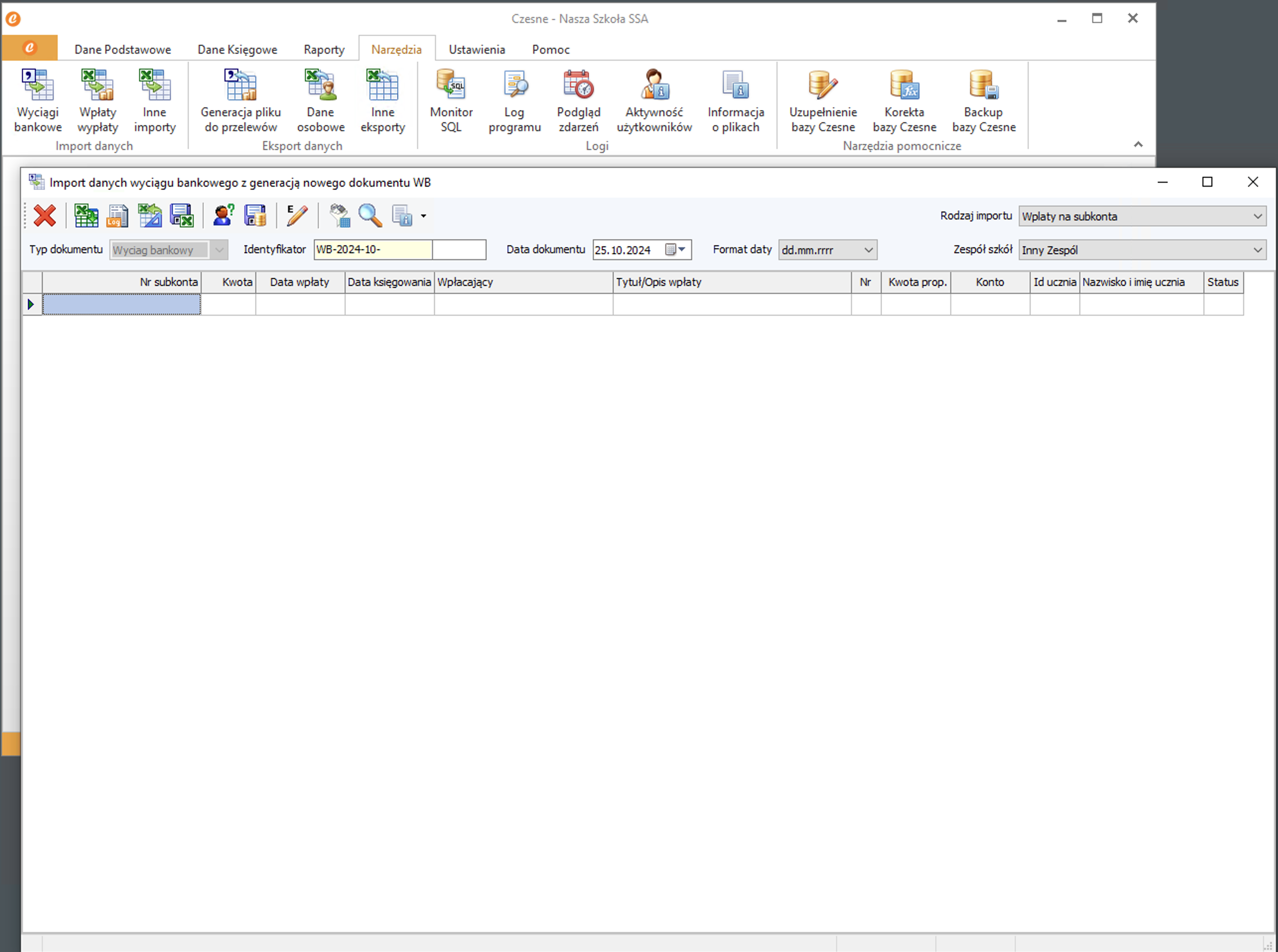 Możliwość masowego importu danych, w tym podstawowych informacji o uczniach, zniżek oraz przypisania kont „zewnętrznych”.